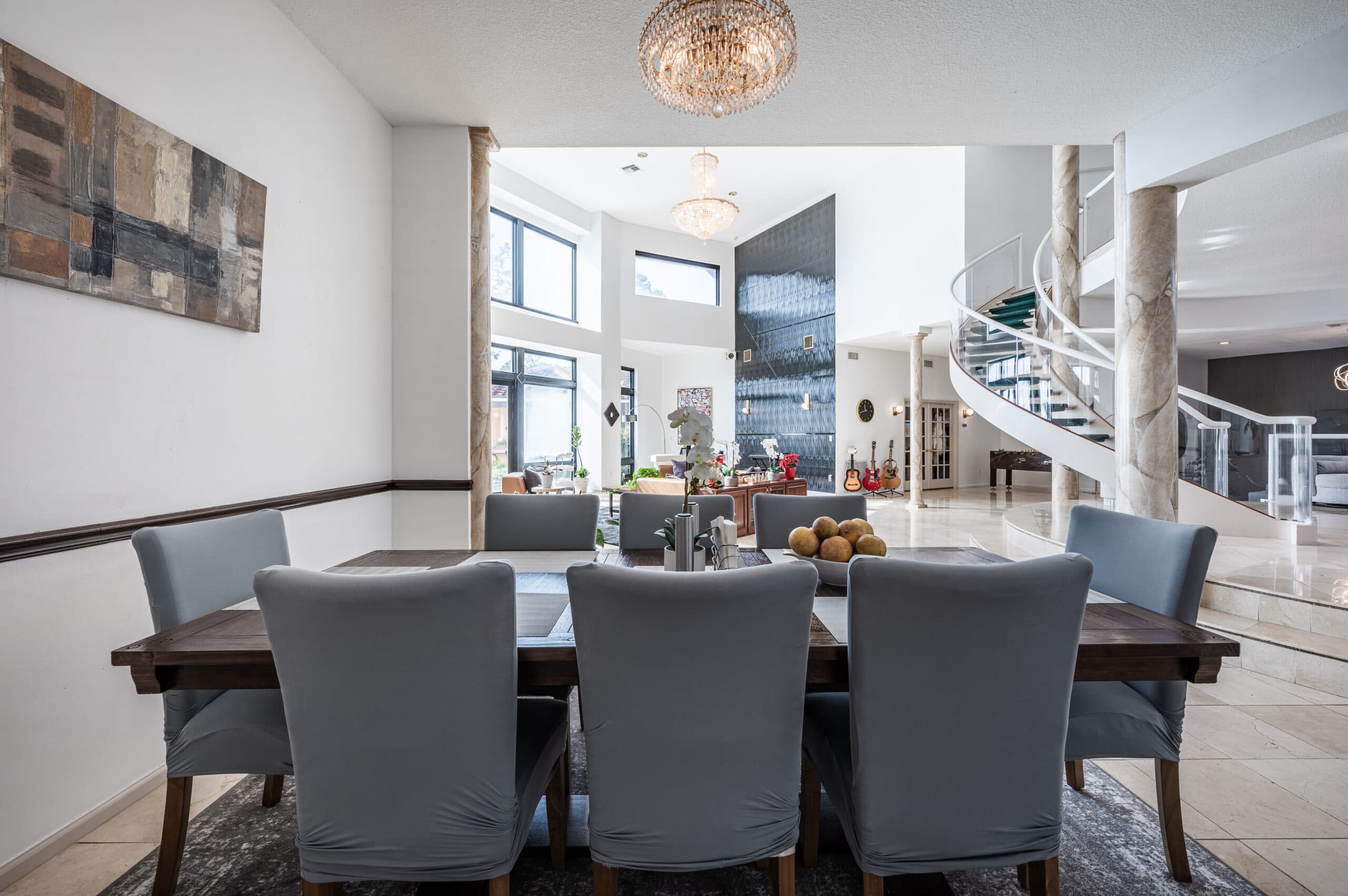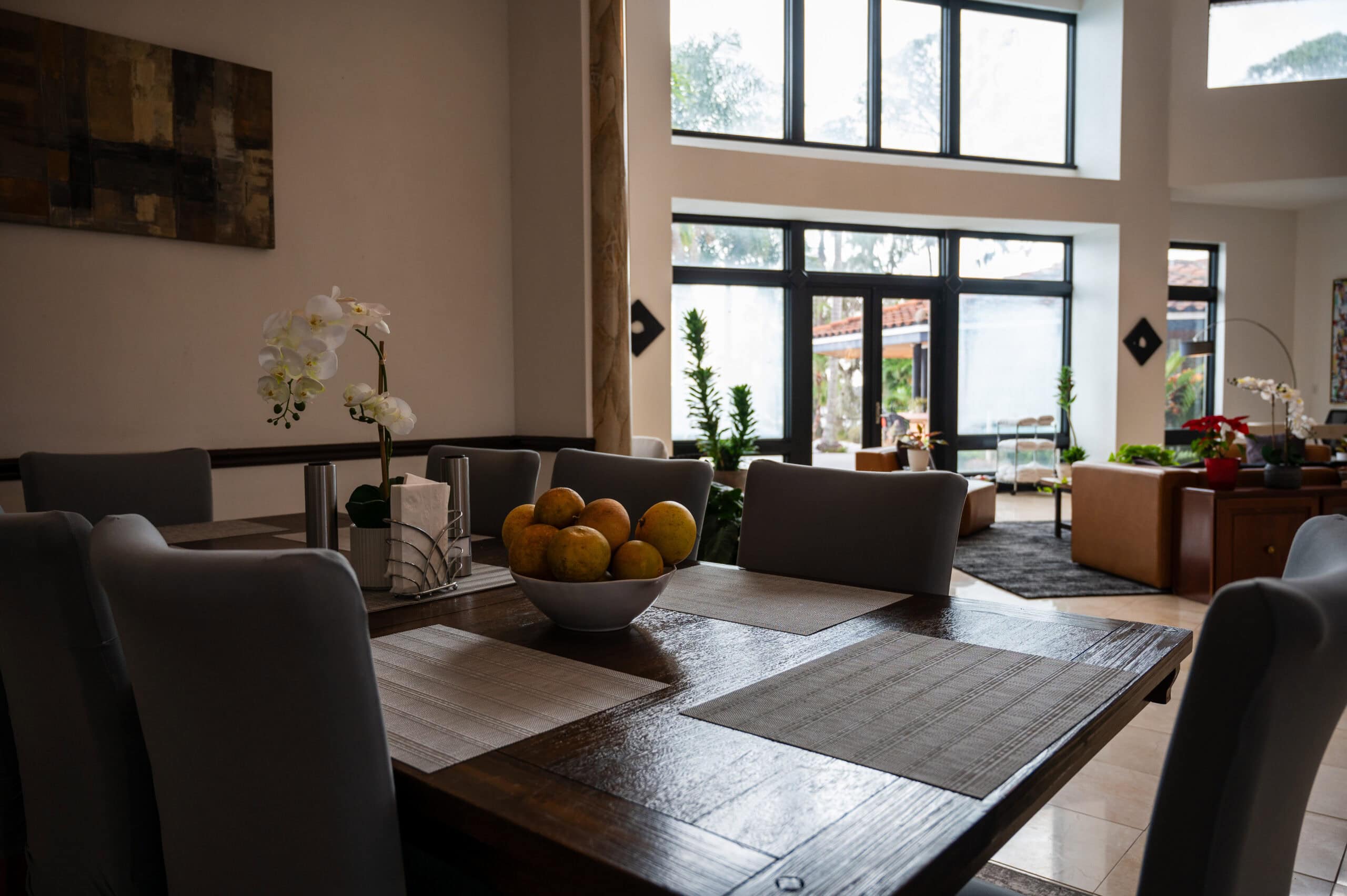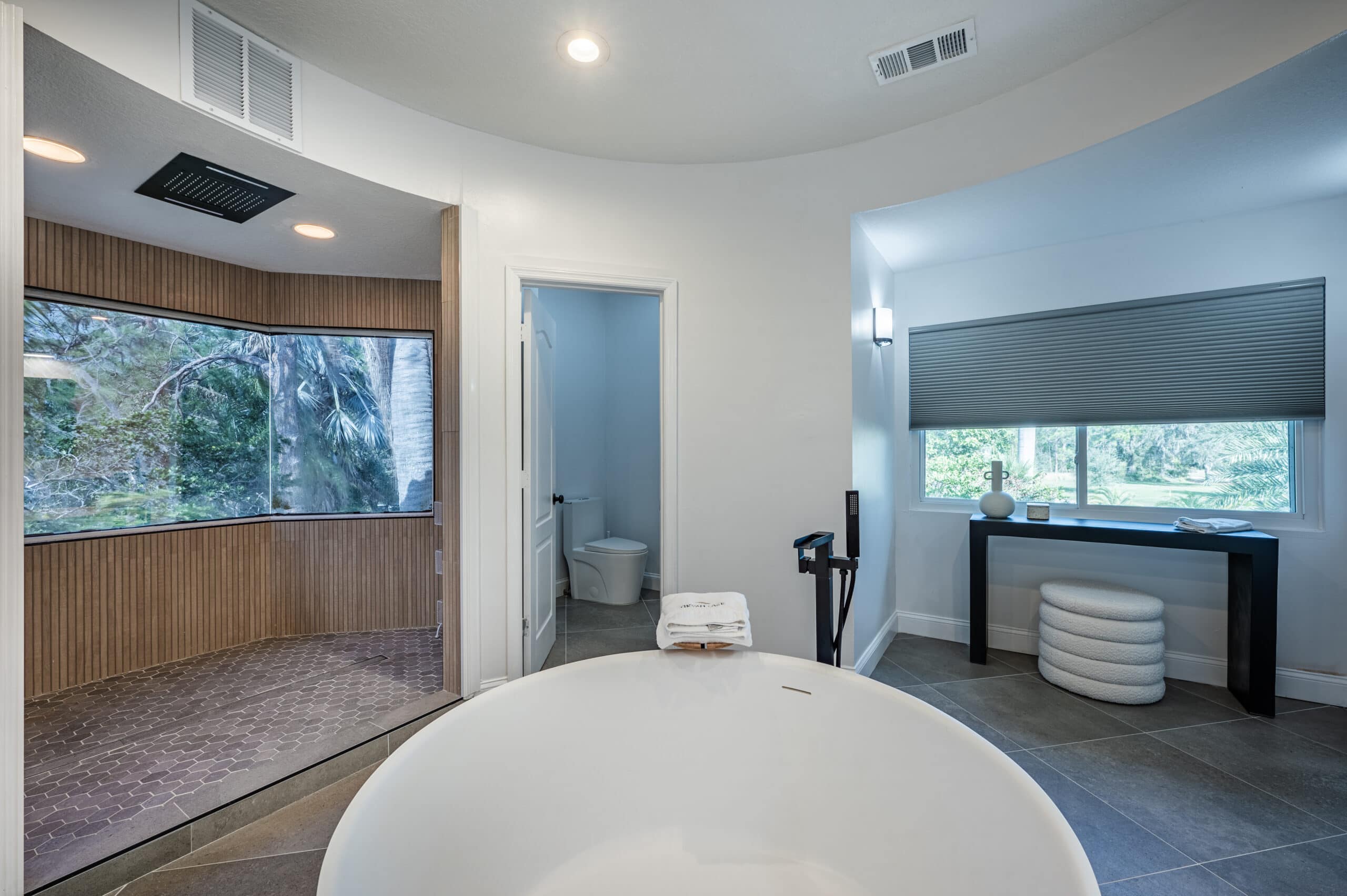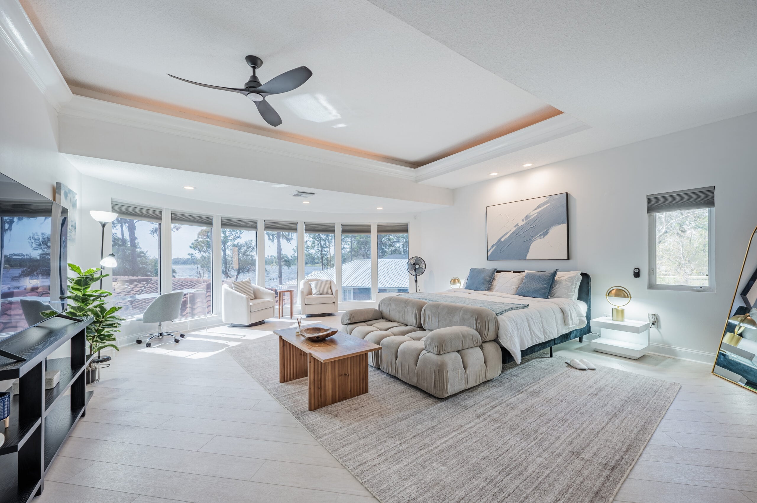 Our villa is a stand-alone guest house on the property. There’s a large bedroom with a rounded wall of windows that overlooks the lake. The bedroom has an oversized walk-in closet, desk, chair and a lounge area for reading. There’s also a living room with a couch, lounge chair, 60” TV screen and a kitchen where meals can be privately served if desired.